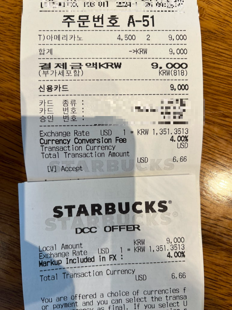 아메리카노 2잔을 시켰고, 9000원에 달러로 6.66이 결제되었다.