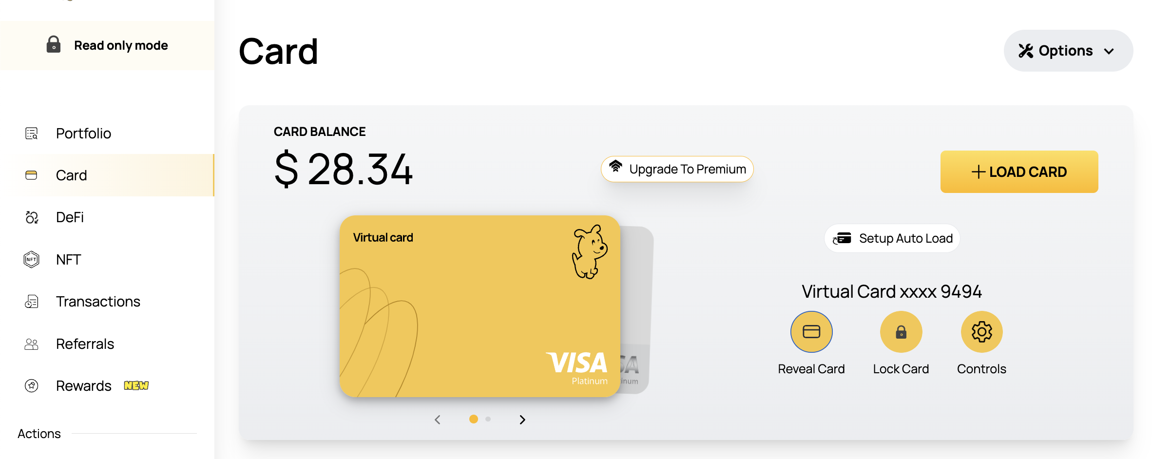- Reveal Card 메뉴 클릭 후 텔래그램에서 인증하고 나면 아래와 같이 카드 정보가 나옵니다.