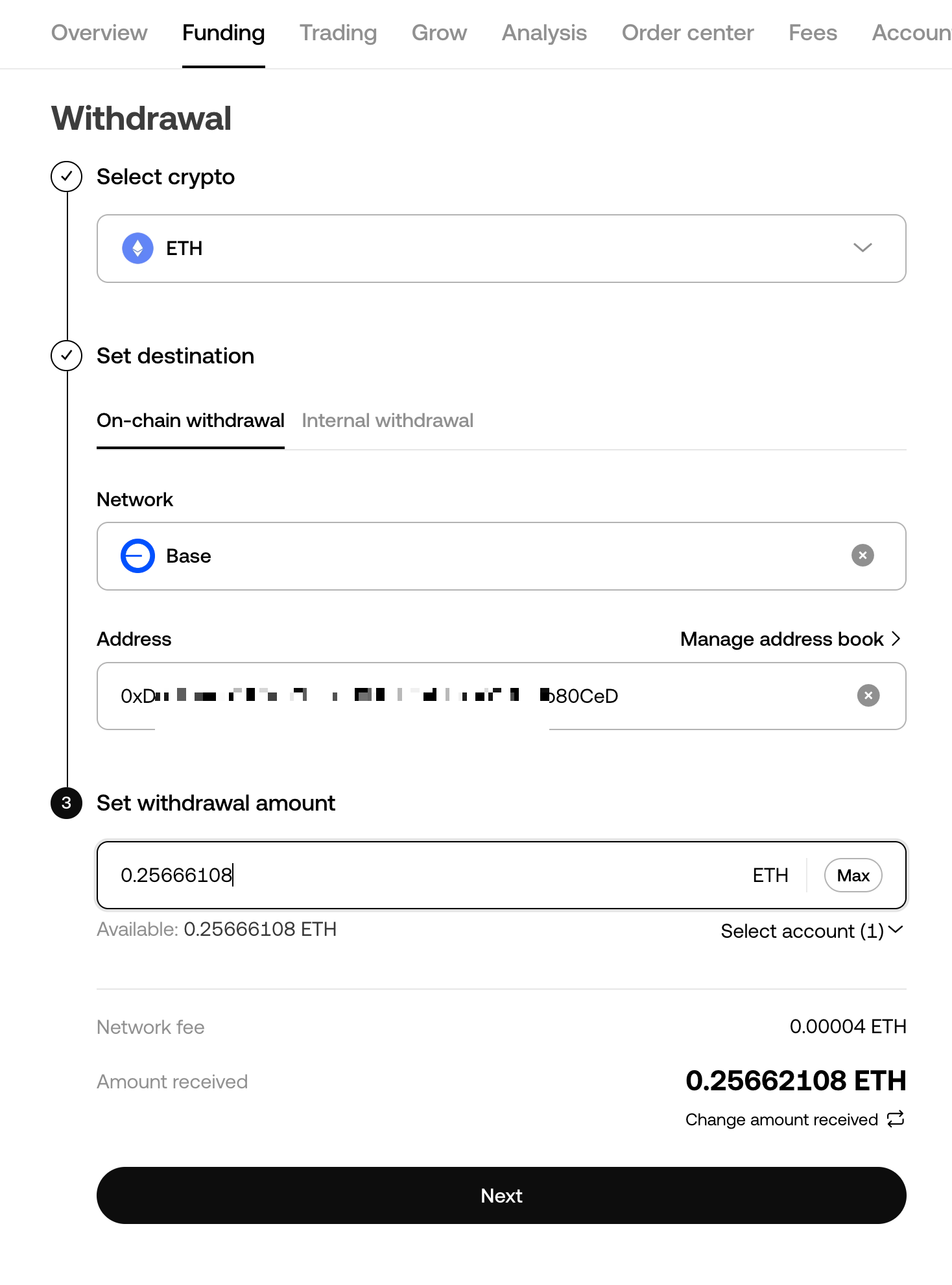 - $1,000 정도 구매 후 출금 메뉴에서 메마의 베이스 이더 주소로 보냅니다.(각자 상황에 맞게, But 최소 $100은 필요함)